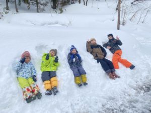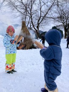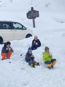 子供たちは雪の上で恒例のカップラーメン