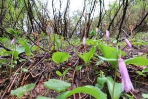 次の我らの課題は5/21開催の黒姫山山開きで、今週末には黒姫山を楽しむ会メンバ-が道標の設置作業を行う予定です。朝早く、磯之辺登山口の状況確認に向かったところ、静寂の中、カタクリも花弁を閉じたまま眠っていました。